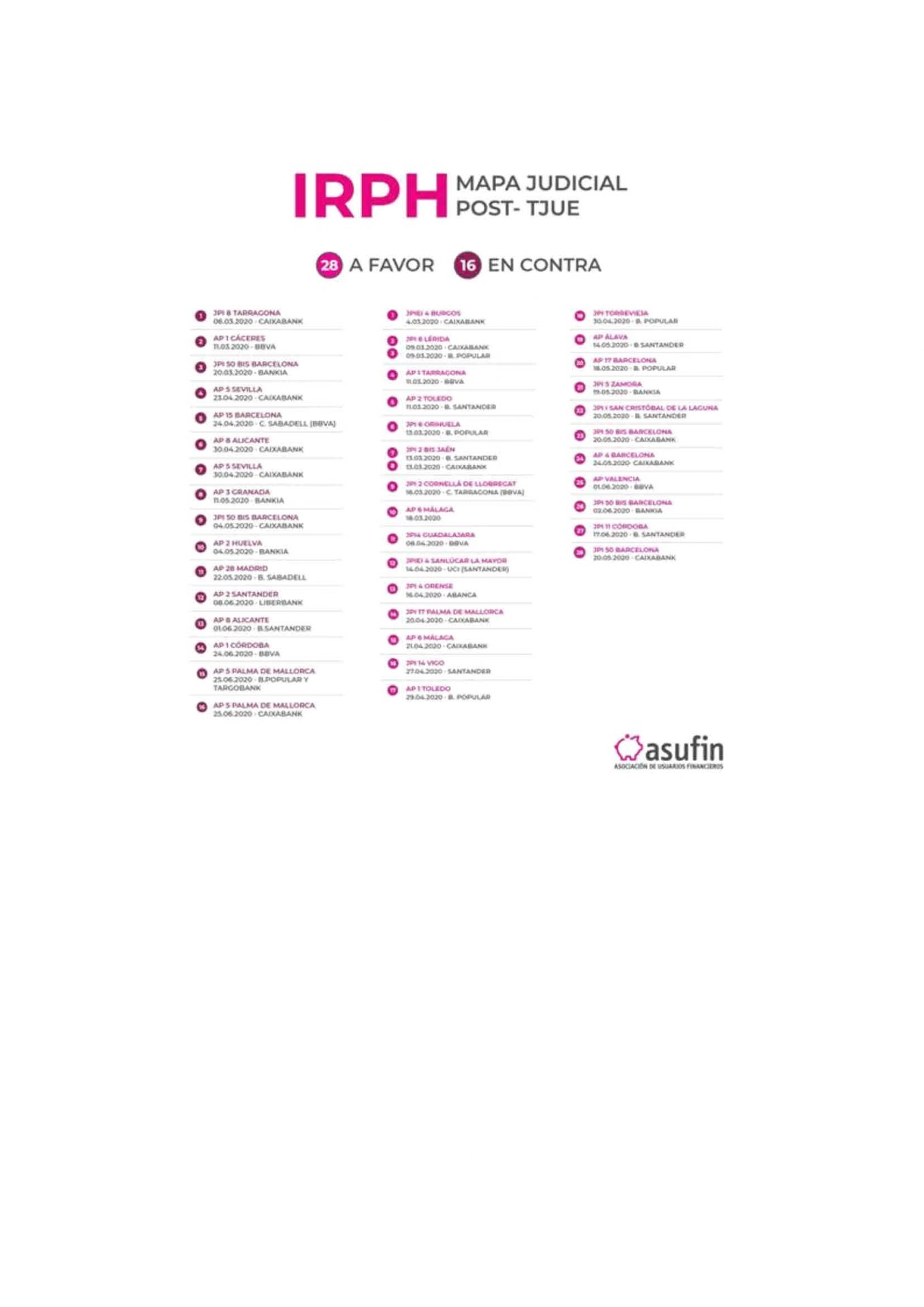 Según la contabilidad de sentencias de IRPH que Asufin está publicando en su página web, desde que el Tribunal de Justicia de la Unión Europea (TJUE) dictó sentencia sobre el IRPH, ha habido 28 decisiones judiciales a favor de los afectados y sólo 16 que favorecían los intereses de la banca.